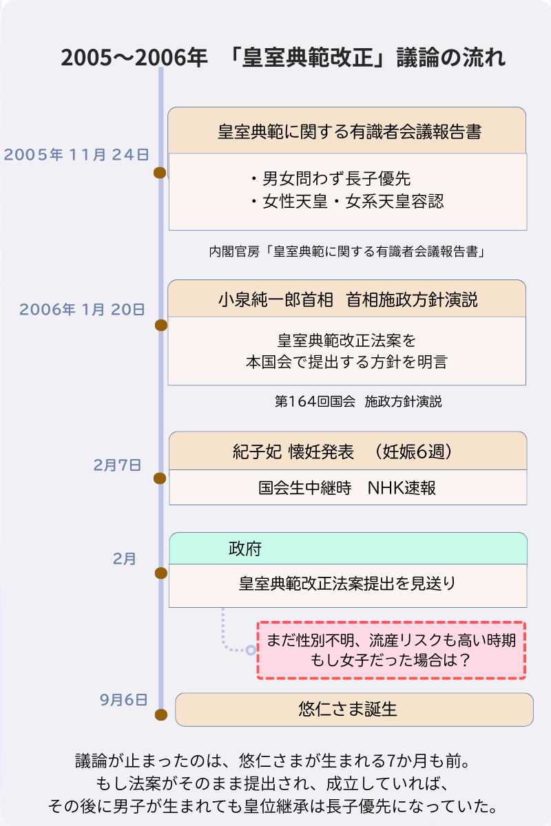 約20年の出来事を並べてみると、現在の「男系男子維持」という結論に至るまでの流れが見えてくる。